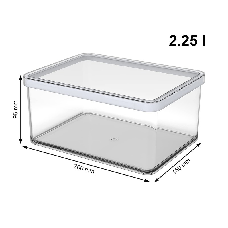 - Box contents: 1 rectangular storage box including lid. Capacity 2. 25 L. Dimensions approx. 20 x 15 x 9 6 cm (L x W x H) – Base and lid transparent, sealing ring white – Made in Switzerland