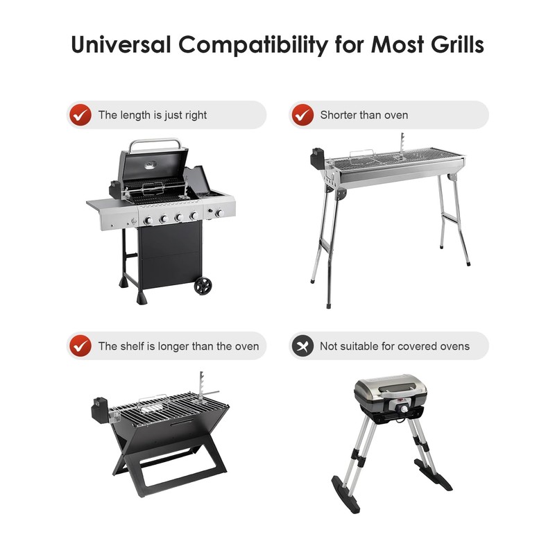 - 【Universal Compatibility for Every Grill】Discover the convenience of our UL-certified universal grill rotisseries roaster that integrate with a wide range of grill brands and models. Whether you own a gas grill, charcoal grill, or electric grill, our kit's adjustable components guarantee fit, unlocking the world of rotisserie cooking for everyone. Elevate your barbecue experience with this must-have accessory.