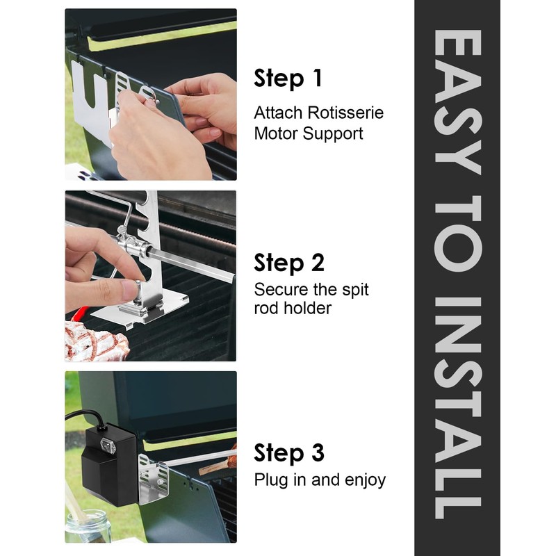 - 【Effortless Rotisserie Cooking Experience】Enjoy a hassle-free rotisserie cooking experience with our powerful 120V 4W motor. This high-performance motor ensures a steady rotation of the spit rod, evenly cooking your favorite meats to perfection. Sit back, relax, and let our kit do the work for you. Compatible with popular chicken rotisserie machines our kit enhances your grilling prowess.