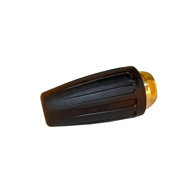 The RotoJet rotating nozzle enhances cleaning efficiency by combining the impact of a 0-degree flat nozzle with the coverage of a 25-degree pattern. Producing up to 5800 PSI of cleaning power, it is suitable for various high-pressure applications.