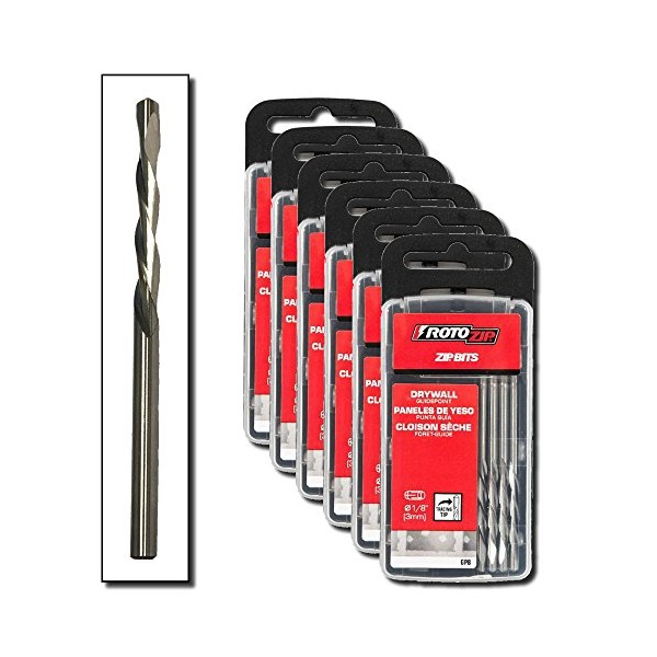 Rotozip 1/8" Guide Point Bits (Contains 6 packages of 8 bits ea.) Cuts drywall with a guidepoint end that follows around, instead of cutting through, an obstacle like an outlet box 1/8" diameter. 48 bits per pack