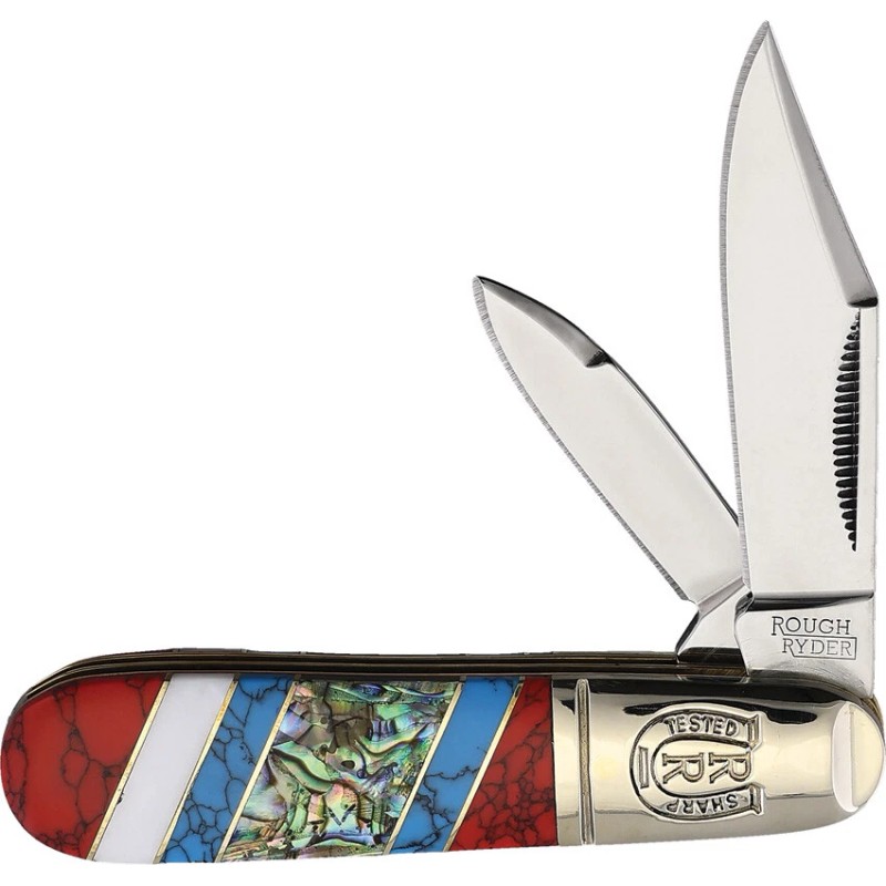 New Barlow Stoneworx. 3.25" (8.26cm) closed. Mirror finish stainless clip and pen blades. Nickel silver bolster(s). Red stone, Abalone, Mother of Pearl, green malachite, and turquoise handle. No two pieces are exactly alike. Boxed.