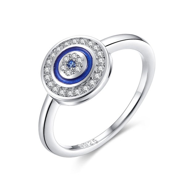 Round Blue Evil Eye Band Ring in Sterling Silver 925 Cubic Zirconia & Enamel[Size 7]