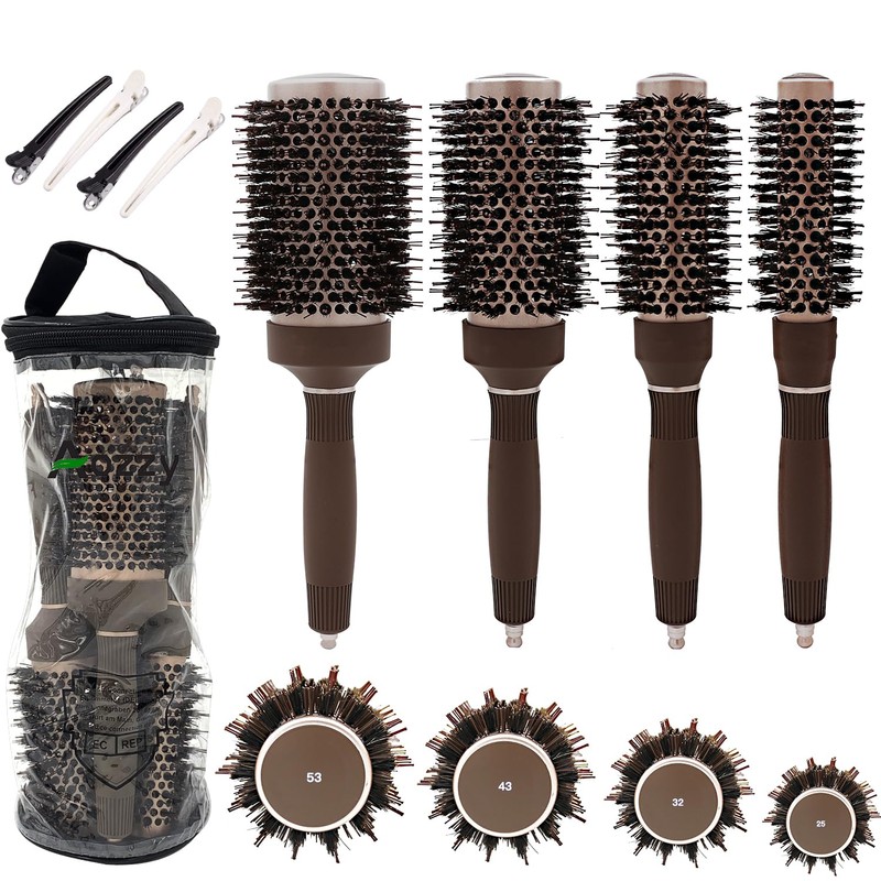 - 4-piece round brush set Aozzy round brush set have diameters of 25 mm, 32 mm, 43 mm, 53 mm, 25 mm are for short hair, 32 mm are for short hair and medium length hair, 43 mm and 53 mm are for medium and long hair. Whether short hair, fine hair, long hair or fringe hairstyle, with the right Aozzy round brush, daily styling is easy.