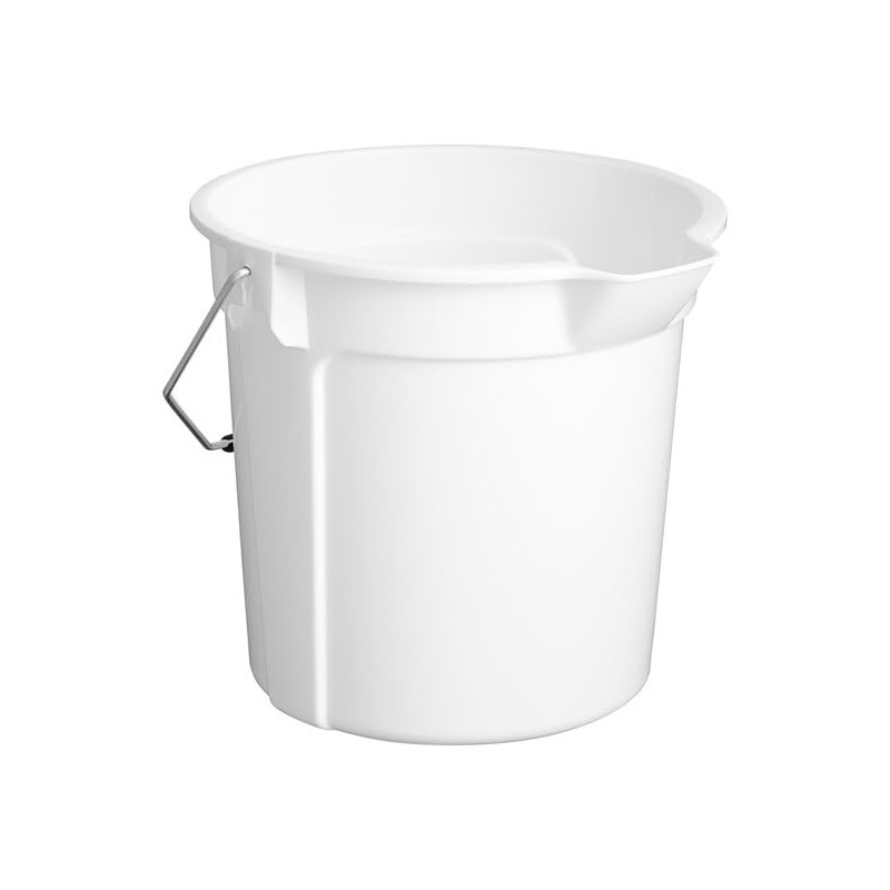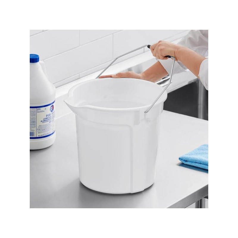This versatile 14-quart white round bucket by Lavex is engineered for superior performance in commercial cleaning and warewashing applications. Crafted from heavy-duty HDPE construction, it offers exceptional durability while maintaining a lighter weight than traditional materials. The thoughtfully designed features include a comfortable plastic grip handle for secure transport, convenient measurement graduations inside for precise filling, and a wide pour spout that enables spill-free emptying. With a generous 3.5-gallon capacity and stackable design, this bucket maximizes both functionality and storage efficiency. The white color helps maintain organized cleaning systems and prevents cross-contamination between different cleaning solutions. Whether you're maintaining a busy restaurant kitchen, managing facility services, or handling general cleaning tasks, this robust bucket delivers reliable performance day after day. Its practical combination of durability, user-friendly features, and professional-grade construction makes it an essential addition to any commercial cleaning arsenal.