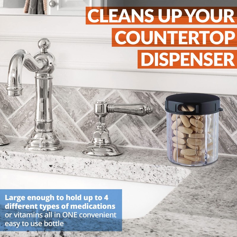 - CLEANS YOUR WORKPLACE AND CABINETS: If you have been looking for a better way to declutter your bedside table, countertop or medicine cabinet and don't want to hide your pills, then this medicine dispenser is the perfect solution! That's because our product is large enough to hold up to 4 different types of medications or vitamins in one convenient, easy-to-use bottle. So you can always have your medication in view and stay tidy