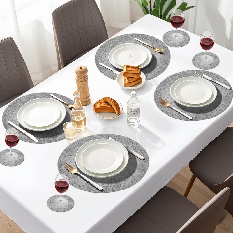 Round Placemats and Coasters Set of 4, Floral Leather Table Place Mats 34cm Dual Sided Placemats Non-Slip Heat Resistant Placemats Kitchen Coffee Table Mats Washable (Gray)