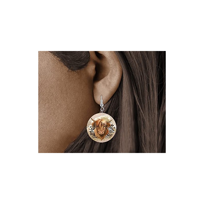 Round Wood Earrings Light Weight Printed Image Dangle Jewelry (Highland Cow)