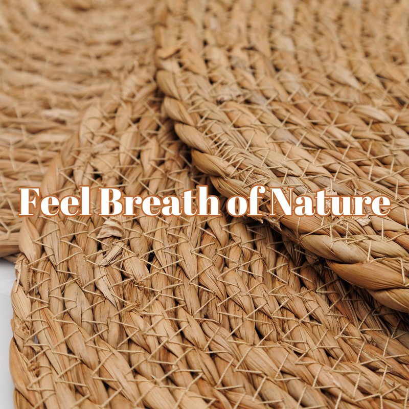 - [Natural Round Placemats Set] Lynnerson 13.7 inch round woven placemats set of 8 is made of natural plants materials. Unique woven texture of the water hyacinth place-mat is clearly visible with natural color, and each weave reveals the craftsmanship of the craftsman. When you take out the water hyacinth placemats, you can feel each mat conveys the breath of nature, adding a natural charm to the home environment.