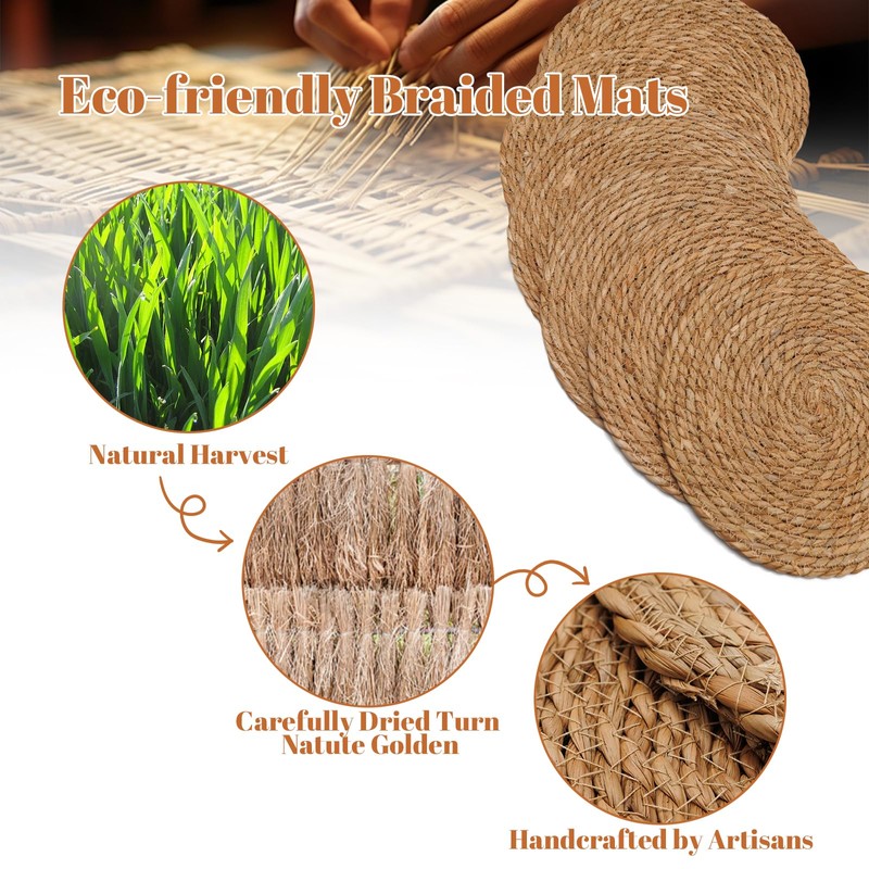 - [Eco and Sustainable Option] Rustic braided wicker table mats are made of natural materials, which is strong and durable for years of daily use. It is easy to clean and maintain. Most woven placemats gently rubbed to remove stains. Choosing natural table mat will not only reduces the reliance on disposable tableware, but also reflects the user's pursuit of environmental protection and sustainable living.
