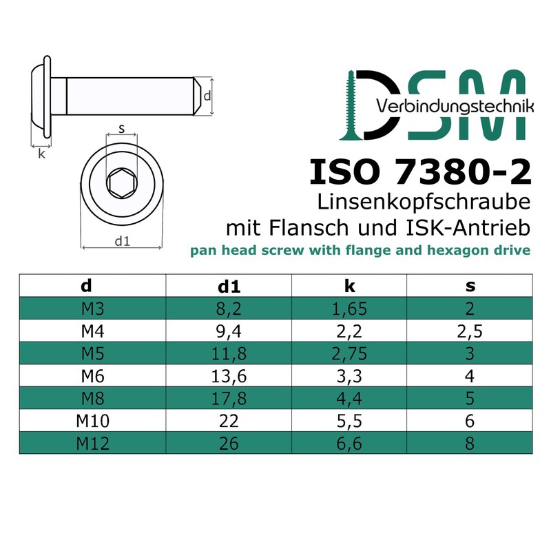 - Rounded head screw with flange and hexagon socket (ISK) according to standard: ISO 7380-2