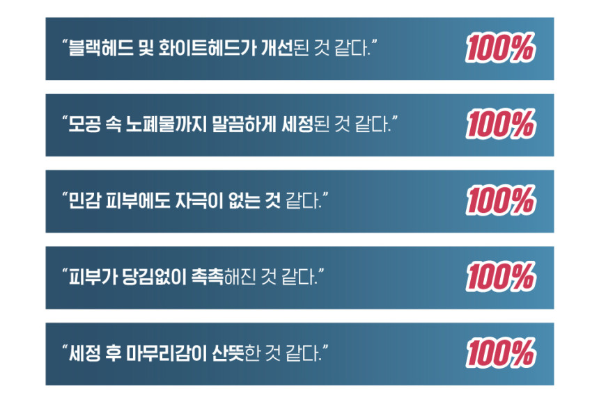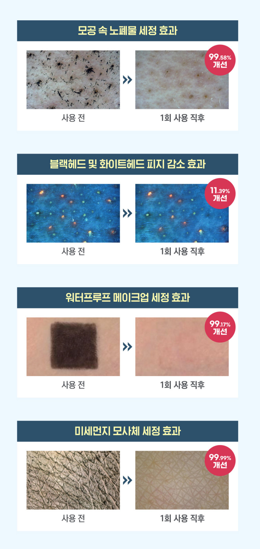 모공 속 노폐물 세정 효과, 블랙헤드 및 화이트헤드 피지 감소, 워터프루프 메이크업 세정 효과, 미세먼지 모사체 세정 효과,