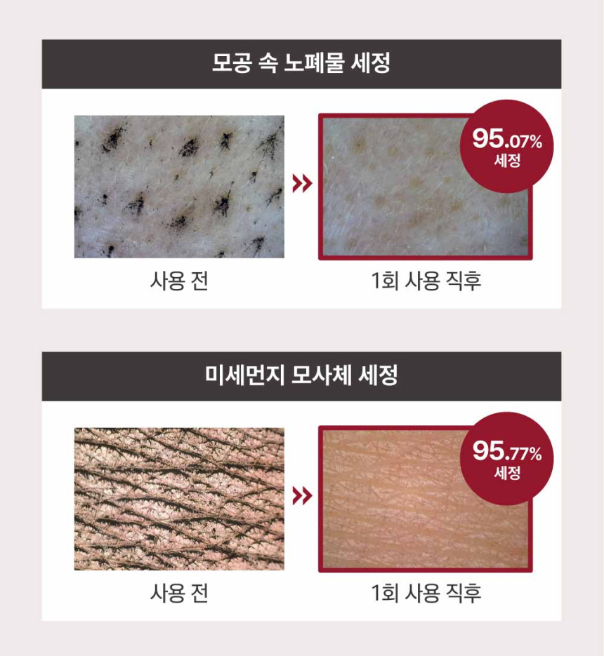 모공 속 노폐물 세정 효과, 미세먼지 모사체 세정 효과, 모공부위 탄력, 피부 결, 즉각 보습 개선에 대한 인체 적용 시험