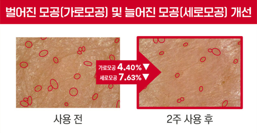 피부 더블 탄력(겉탄력, 속탄력) 레이어드 효과, 벌어진 모공(가로모공) 및 늘어진 모공(세로모공),