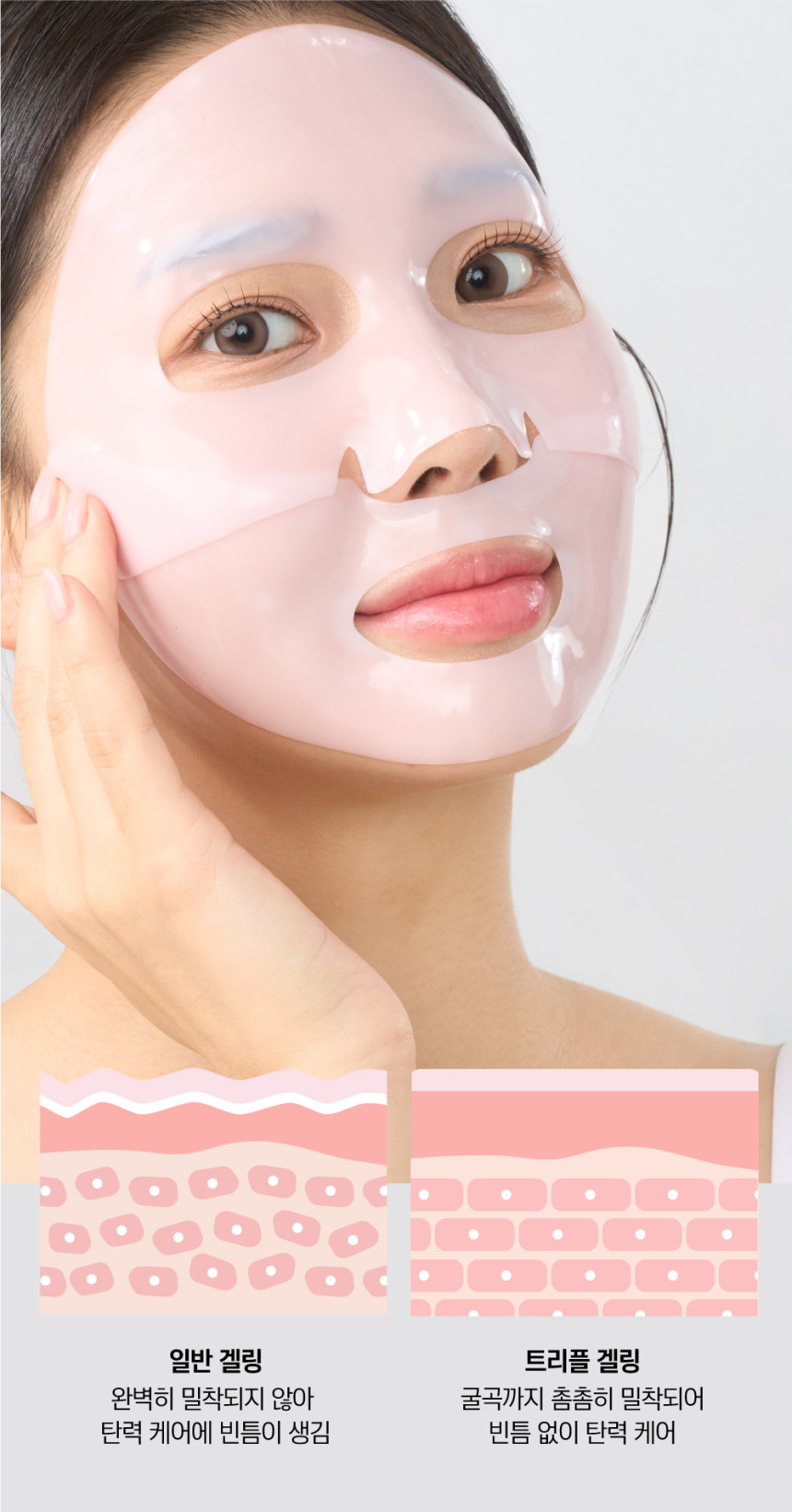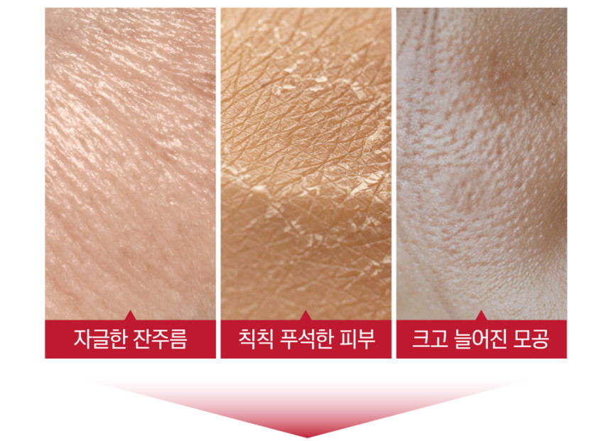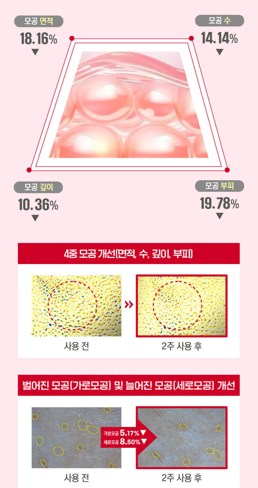 피부 더블 탄력(겉탄력, 속탄력) 레이어드 효과, 4중 모공(면적, 수, 깊이, 부피), 벌어진 모공(가로모공) 및
