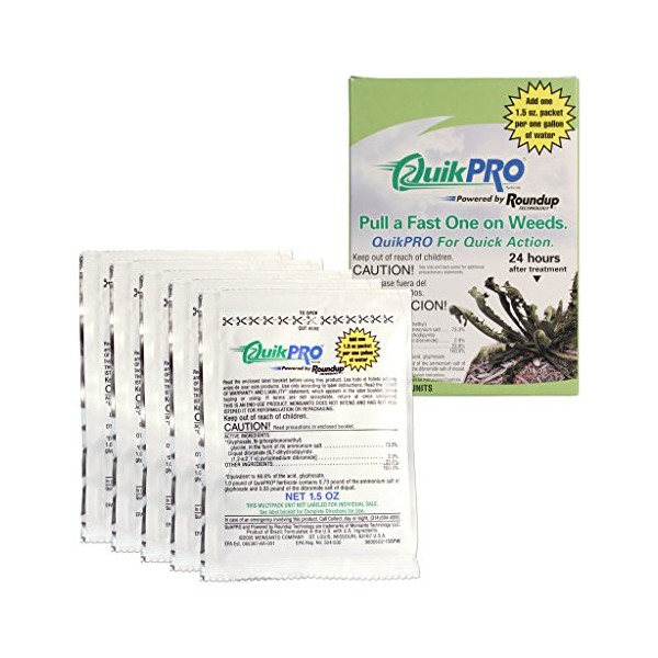 RoundUp Quick Pro from Monsanto combines glyphosate and diquat into one easy to use powder for fast control of tough weeds. It provides systemic post-emergent control of most annual and perennial weeds. The addition of Diquat allows for quicker weed absorption before rain can wash the solution away.