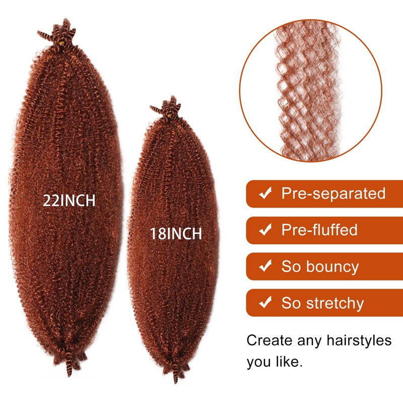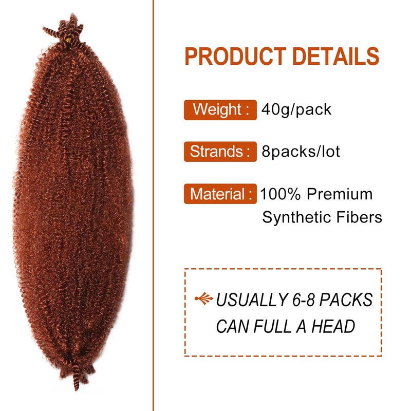- 【Package】: Springy afro twist hair, 18/22 inch, 8 strands/pack, weight : 40(±5)g /pack. Available colors: 1b, 1b/27, 1b/30, 350, purple, 4#, burg. Usually 6-8 bundles can make a full head.
