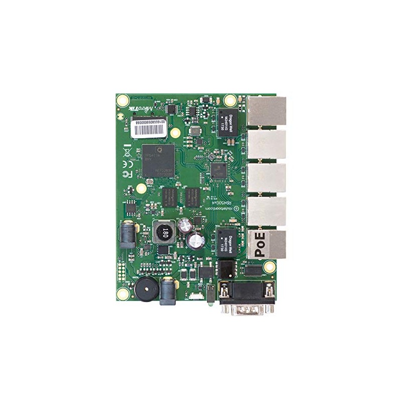 The RB450Gx4 is an Ethernet router with five Gigabit Ethernet ports, a serial port, 512 MB NAND memory and a microSD card slot. In addition, it supports full 10 V - 57 V input by two power jacks or PoE (802.3af/ at or passive PoE) and can provide PoE output for Ethernet port #5. It is powered by MikroTik RouterOS. It comes without an enclosure, you are free to use it in your own. The device form factor is identical to our previous RB850 and RB450 series, so you can even use the same enclosures. The device is powered by a quad core ARM CPU, has 1 GB of RAM and supports hardware IPsec encryption. The device is powered by RouterOS - the operating system, which will turn this powerful system into a highly sophisticated router, firewall or bandwidth manager.