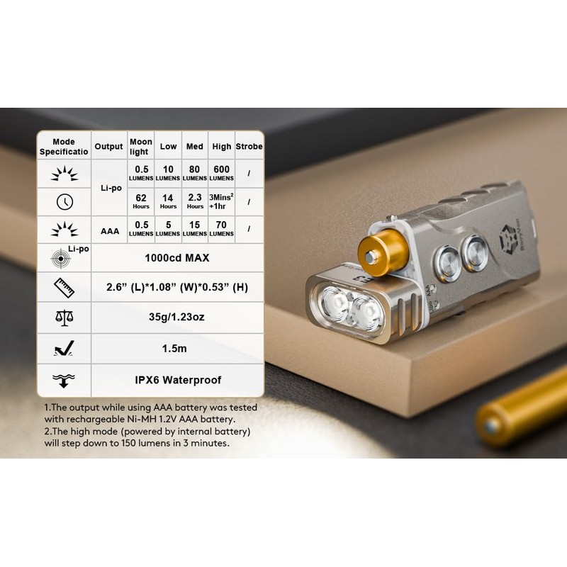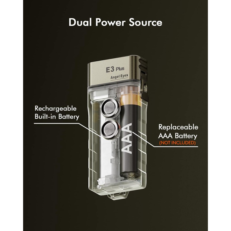 - Dual Power Supply: The E3 Plus small keychain flashlight, powered by a built-in battery(included), and also work with the external (1.2/1.5V)replaceable battery, which extends its battery life when recharging is not available outdoor.