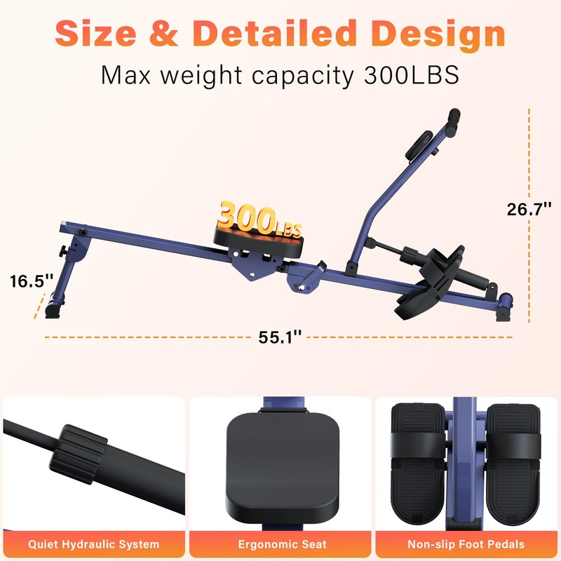 Rowing Machines for Home, Hydraulic Rower Compact Foldable, 300LBS Weight Capacity with 12 Levels Adjustable Resistance for Full-Body Cardio Workouts