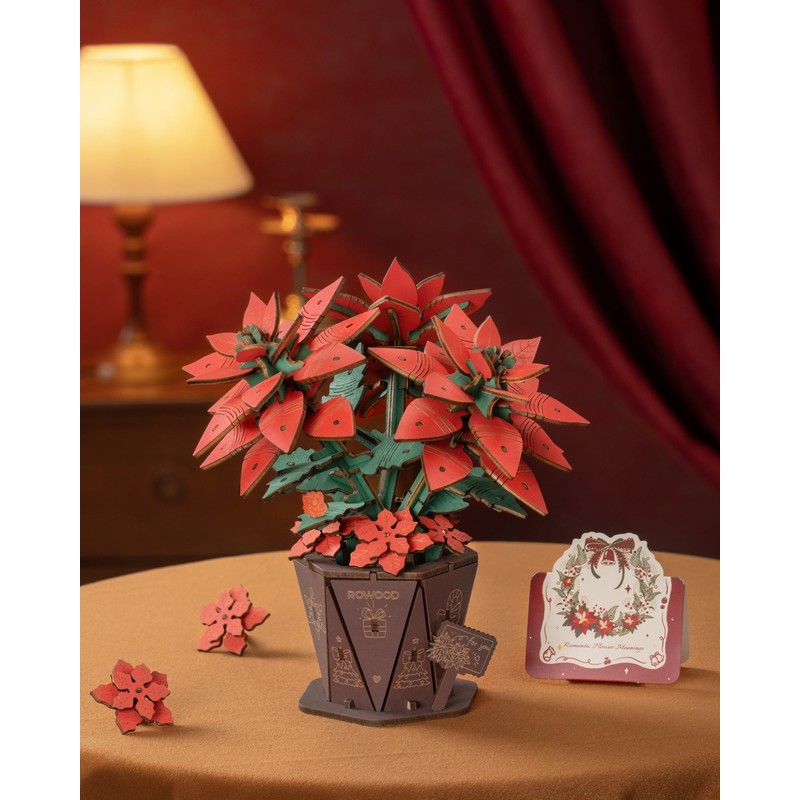 - Wooden Poinsettia Model Kit: Assemble a beautifully crafted wooden poinsettia flower with precisely cut pieces that fit smoothly. Easy 1-hour assembly with no glue or tools required, making it a relaxing hands-on project that adds natural wooden elegance to desks, living rooms, or offices