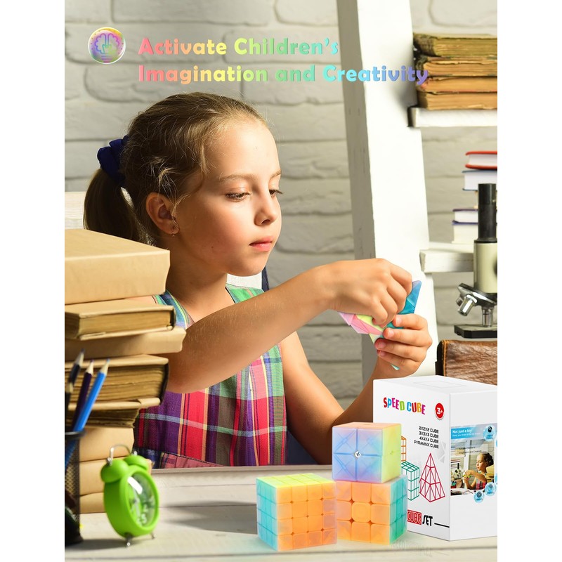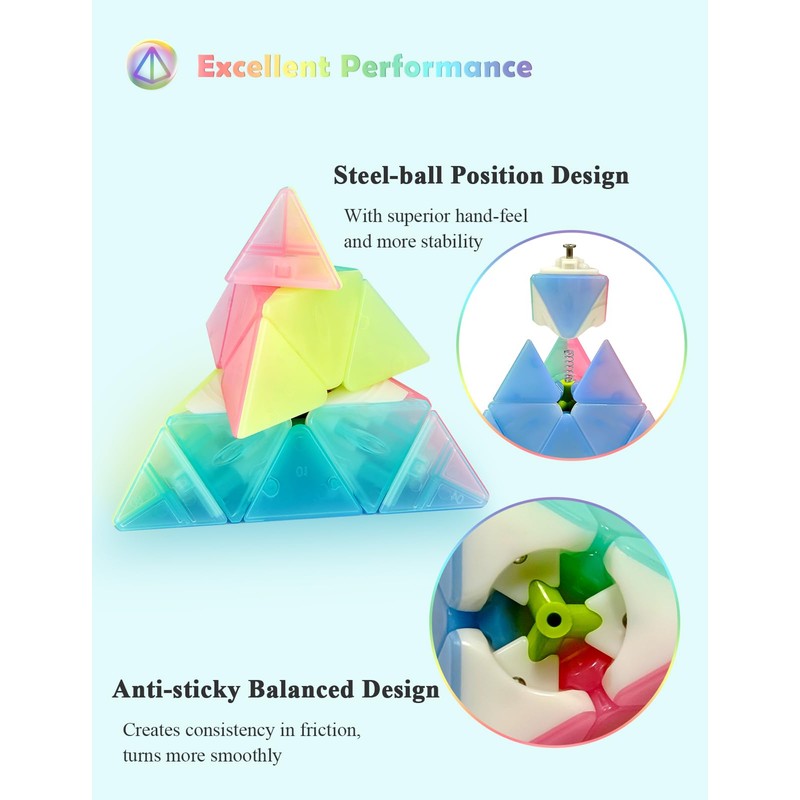 • Classic colour combination – the jelly cube set (2 x 2, 3 x 3, 4 x 4 pyramid cube) is the classic colour-coordinated puzzle game. Four different levels to meet all your needs, suitable for professionals and beginners. Definitely a good choice for you to get good marks in the Speed Cube competition!