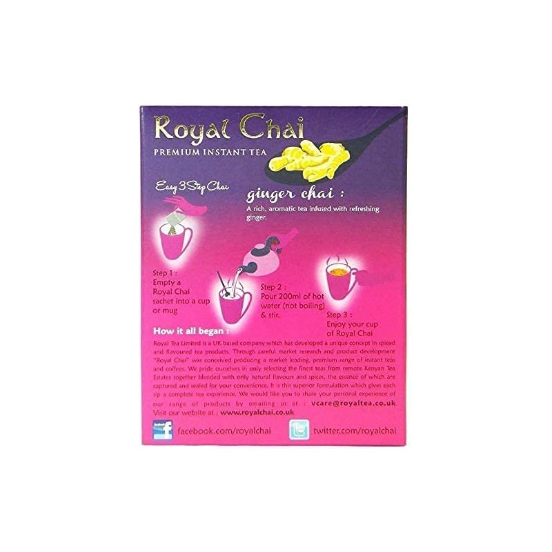 Royal Tea Limited is a UK based company, which has developed a unique concept in spiced and flavoured tea products. Through careful market research and product development, “Royal Chai” was conceived producing a market leading, premium range of instant teas. This instant tea includes ingredients like , Skimmed Milk Powder, and Black Tea Extract (5%), Natural Ginger. Each sachet is small enough to carry around without hassle, so perfect for those who are on the go and can still enjoy their favourite traditional Indian chai. With Royal Instant Tea you can make authentic Indian tea in seconds. The Royal Ginger tea contains no added preservatives and flavours.