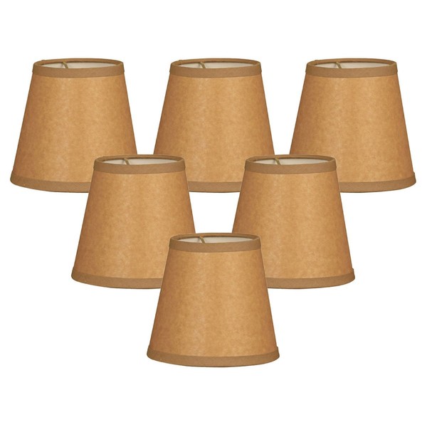 This 6-pack of 5 inch Parchment empire brown chandelier lampshade - 3 x 5 x 4.5 is a part of royal designs, Inc. Timeless chandelier shade collection and is perfect for anyone who is looking for a simple yet stunning lampshade. Royal designs has been in the lampshade business since 1993 with their multiple shade lines that exemplify handcrafted quality and value. Exterior material: high quality heavy Parchment paper interior fabric: off-white Lining fitter: flame clip (fc) fitter designed to fit over a candelabra bulb base. (Most clip-on lampshades are designed with double clip) suggested maximum wattage is 60-watt candelabra bulb. Trim: rolled edge trim frame: brass frame that is also rust resistant height is measured by vertical height from top to bottom, not slant of the shade.
