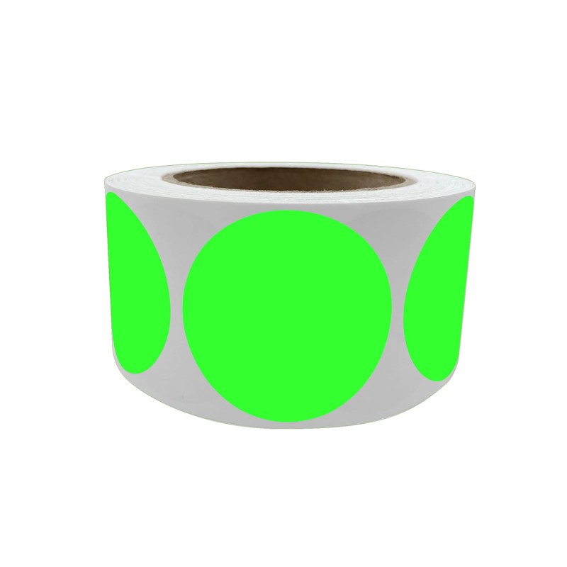 - Fluorescent circle dots stickers measure 50mm and 2 inch comes as labels rolls. Colored dot stickers for inventory and labeling perfect to use in your home, office and school projects. Each colored round sticker is approximately 2" diameter (5cm )