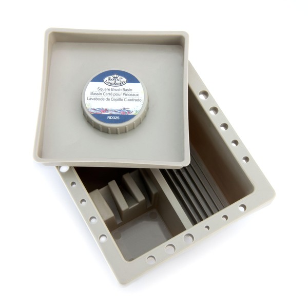Royal & Langnickel Square Brush Basin. Size: 6.5" x 6.5" x 3.5". Made from Plastic. Room to store 22 Paint Brushes. 2 Water Washing Areas. 3 Brush Rests. Grooved bottom for easy brush cleaning.