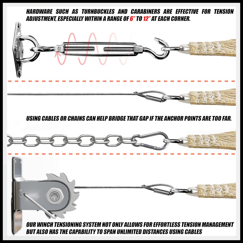 - 【INSTALLATION】: (1) Estimate your desired shaded area. (2) Choose from triangle, square, or rectangle shapes based on pole quantity. Attach using Hardware Kits to roofs, trees, or concrete walls. (3) For cable wire connection, maintain a 0.5 - 2 ft gap between D-Rings and poles. For optimal performance, we would suggest pairing this product with our Shade Sail Hardware Kit. (Hardware kit not included)