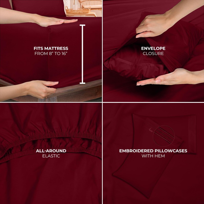 ROYALE LINENS 4 Piece Cal King Sheets Set - Soft Brushed 1800 Microfiber - 1 Fitted, 1 Flat Sheet, 2 Pillow Cases - Wrinkle Free & Fade Resistant - Hotel Luxury Bed Sheets (Burgundy, Cal King)