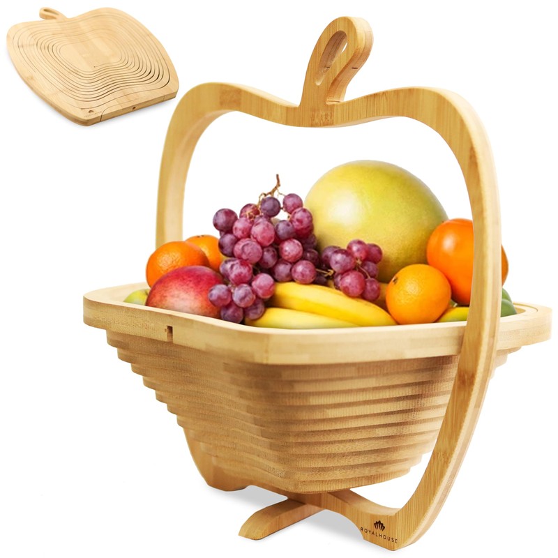 RoyalHouse Bamboo Foldable Fruit Bowl Apple Shape,12“x10.5"- Collapsible, Fruit & Vegetable Storage For Kitchen Countertop, Bamboo Fruit Basket, Tabletop Fruit Serving Bowl
