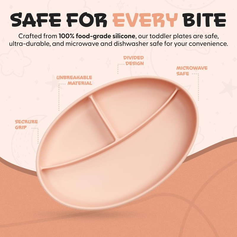 • The Silicone Baby Plate is perfect for babies 6-12 months starting solids. This durable, non-toxic plate features dividers, ideal for portion control and promoting self-feeding. The baby food plate is microwave safe, making it easy to heat meals for your little one. Great as a picky eater plate, it helps encourage independent eating. The unbreakable toddler plates are perfect for active toddlers, and the toddler plates with dividers keep food separated. A must-have for your baby feeding plates collection.