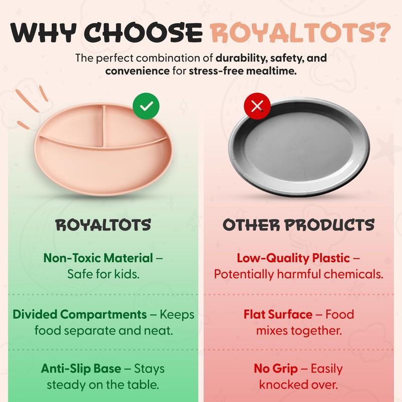 • RoyalTots Silicone Baby Plate is a must-have for toddlers starting solids. This BPA-free, non-toxic baby plate features compartment plates, making it perfect for baby led weaning. Designed for easy self-feeding, our baby silicone plates promote portion control. The durable, non-slip base ensures stability, while the microwave-safe design adds convenience. Pair it with toddler bowls and plates for a complete feeding set, making mealtime a breeze for parents and toddlers alike