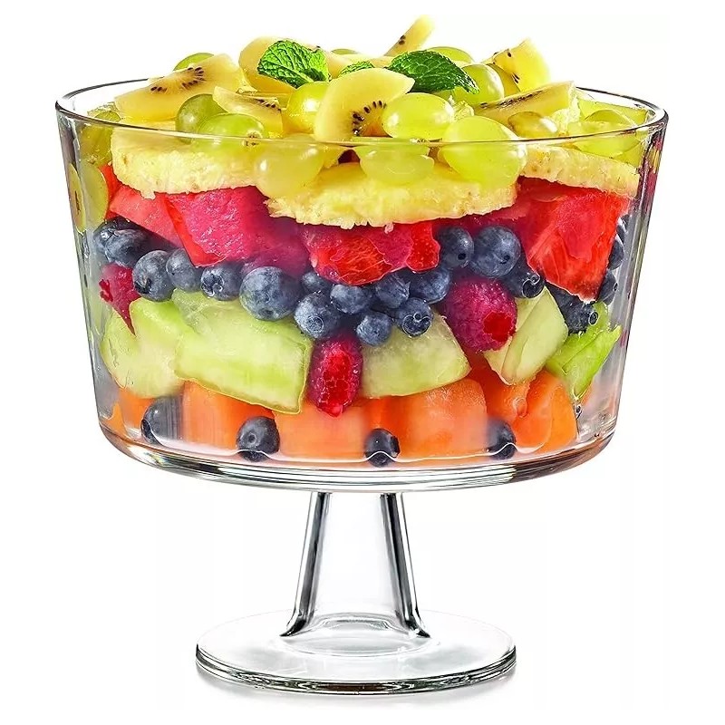 - Modern Glass Trifle Bowl – This X-quart large footed glass bowl makes it easy to highlight desserts, layered cakes, or sweet pastries with a see-through design that enhances the look of your food.