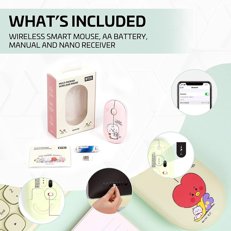 ROYCHE BTS Inspired Characters Multi Pairing Wireless Mouse, Little Buddy Baby Better Together Edition, All in Their Own Cute Style & Colors (TATA)