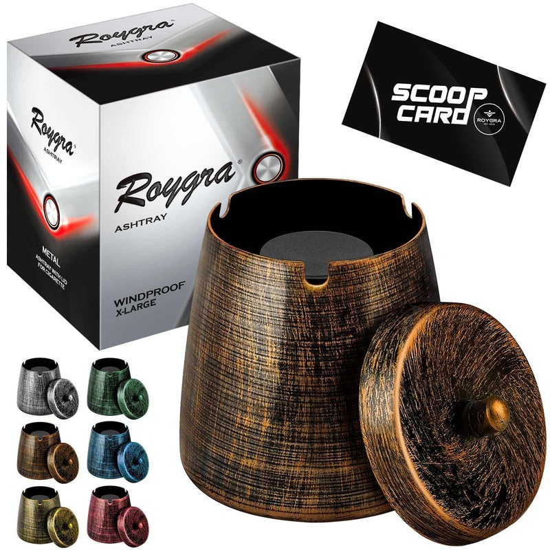 - 💡【roygra Ashtray with Lid】- Made of high-quality metal, equipped with lid, windproof and rainproof. With a pad at the bottom to protect your desktop from scratches.