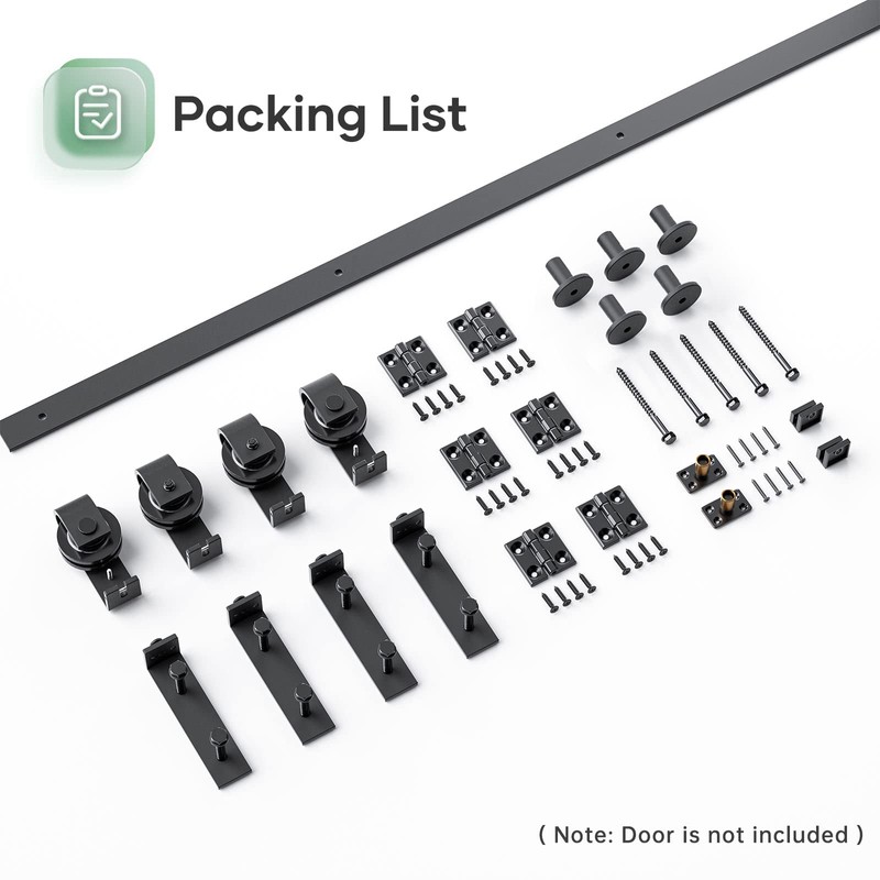 - 【Product Details】Packing: 2x 3.2FT track, 4x roller, 4x roller rotating bracket, 2x roller fixator, 5x spacer, 6x hinge, 2x floor guide, 1x Sealing Strip. Fit Door Thickness: 1-3/8"~1-3/4"(35mm~45mm). [Friendly reminder: DOOR NOT INCLUDED]