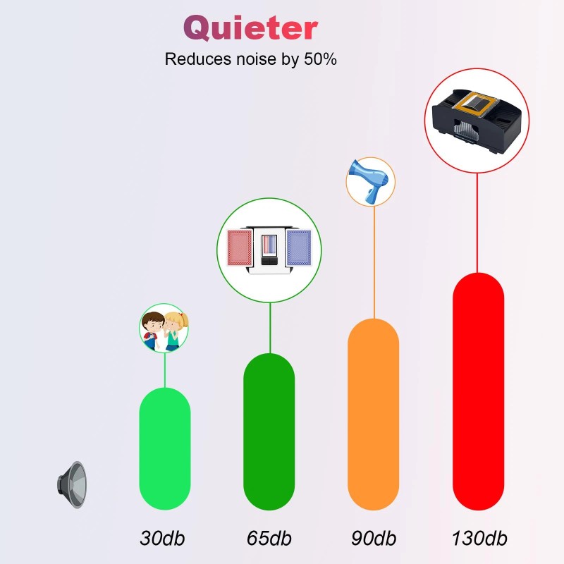 Card Shuffler Innovation Leader: · Quieter: reduces noise by 50% · Smoother & Faster: reduces card jams by 80%. Shuffles one deck in just 2.2 seconds · Ultra-Long Lasting: the 2000mAh rechargeable battery powers up to 2,300 shuffles on a full charge · Retractable Wing: Works great with poker, UNO, skip-bo, phase 10, guanddan, bridge, texas hold'em, and blackjack · Automatic & Manual Modes: "AUTO" Shuffles automatically until all cards are shuffled. "MANUAL" Allows you to stop shuffling anytime as desired