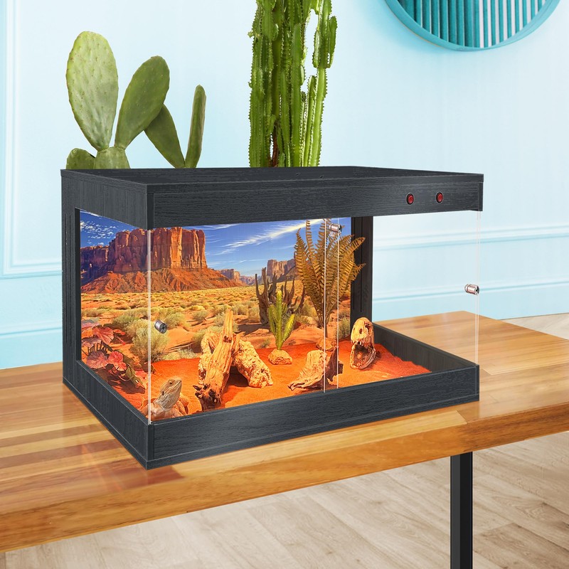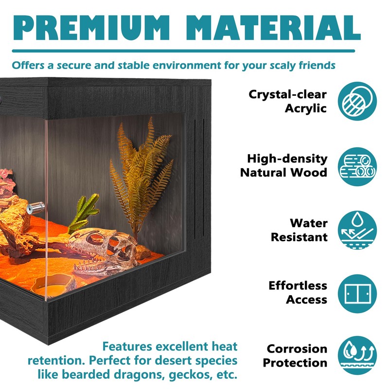 - 【Premium Build & Materials】Crafted from quality acrylic and natural wood with a waterproof coating, our terrarium combines durability with a refined look. The bottom acrylic sheet effectively protects against moisture and spills, ensuring the terrarium remains in pristine condition. Its spacious design offers ample room for your reptile to explore, bask, and hide, promoting natural behaviors and overall well-being.