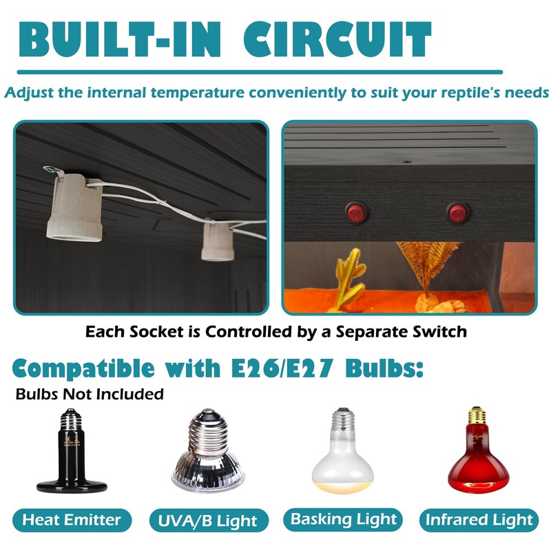 - 【Advanced Electrical System】The integrated electrical system features built-in lamp holders (24/32in has 2 holders, 40/48in has 3 holders), each with individual switch controls, compatible with E26/E27 bulbs (bulbs not included). This allows you to customize lighting and temperature settings to suit your reptile's specific needs.
