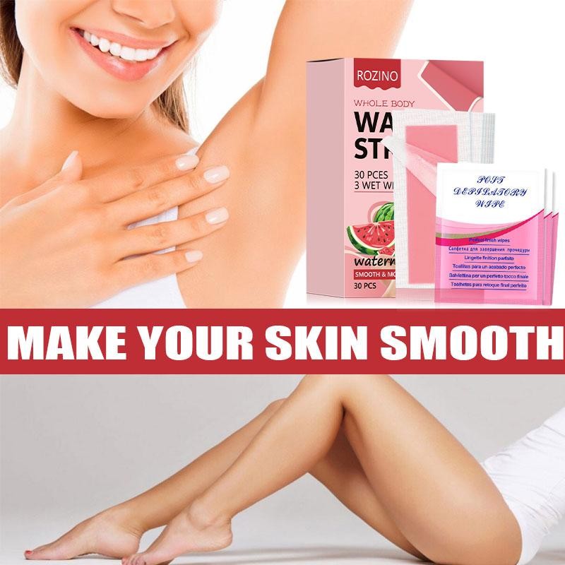 Rozino 30-Pack Watermelon Wax Strips for Face & Body | Dual-Use Design (1 Strip = 2 Parts) | Natural Ingredients (Watermelon, Shea Butter) | Includes 3 Post Wipes