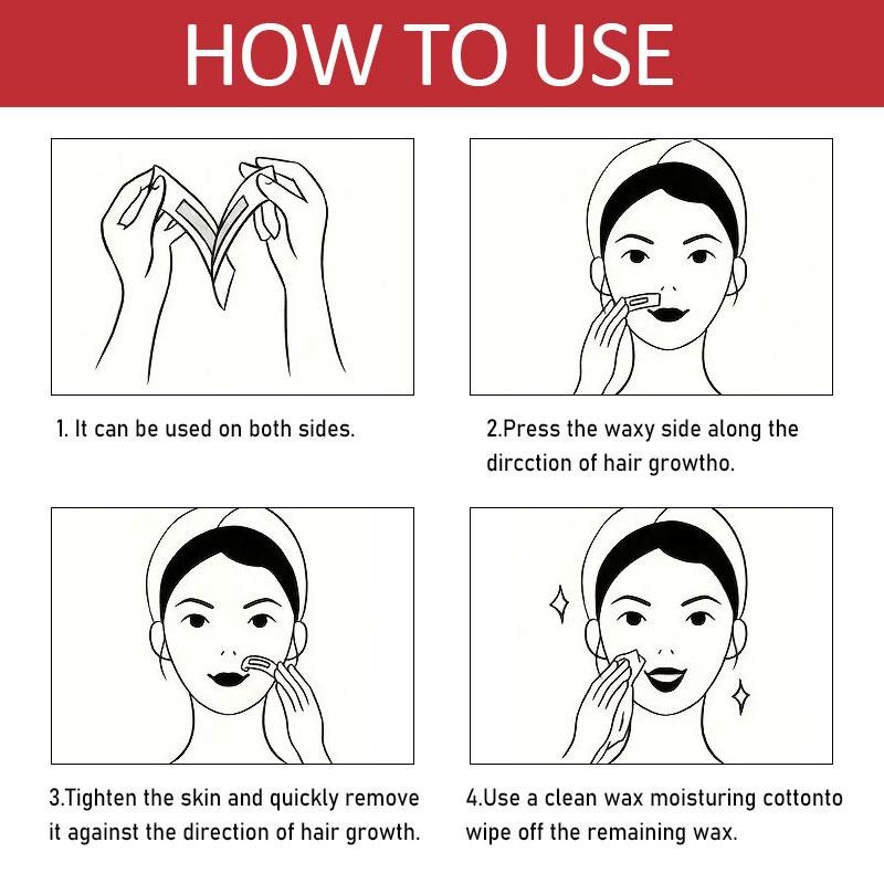 Remove Hair: Gently tighten the skin and quickly pull the strip against the direction of hair growth.