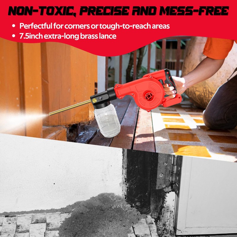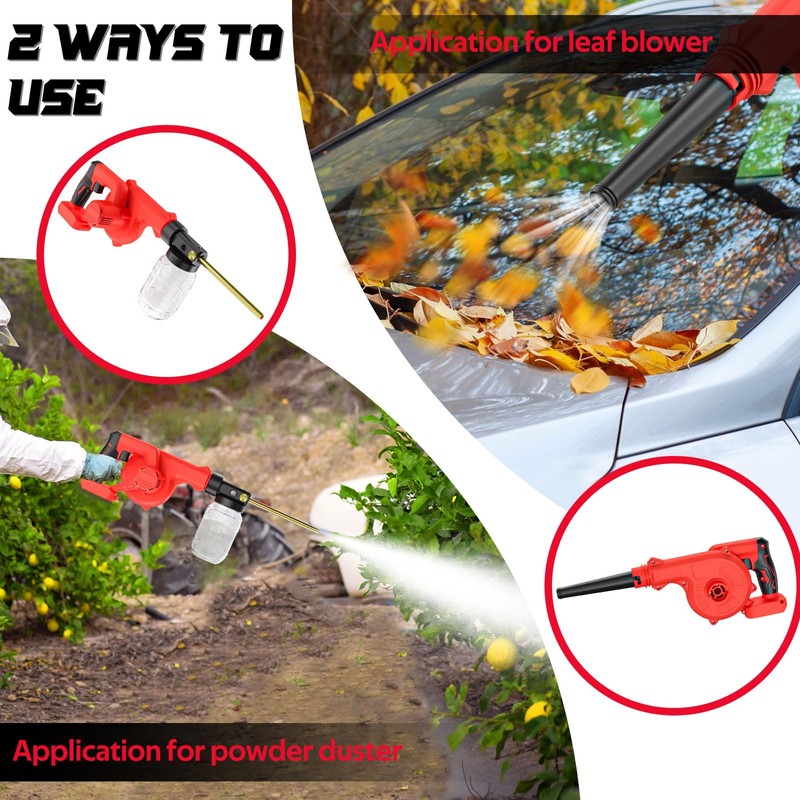 - Easy to Use : Simply align the interface notch of machine with the interface of the applicator and rotate until it locks into place. More than just a duster, this tool transforms into a leaf blower with ease. Clear debris, start campfires, or inflate small items like pool floats. Package: 1x 1L volume spray bottle w/ 7.5inch extra-long brass lance, 1x battery powered blower, 1x tool holder