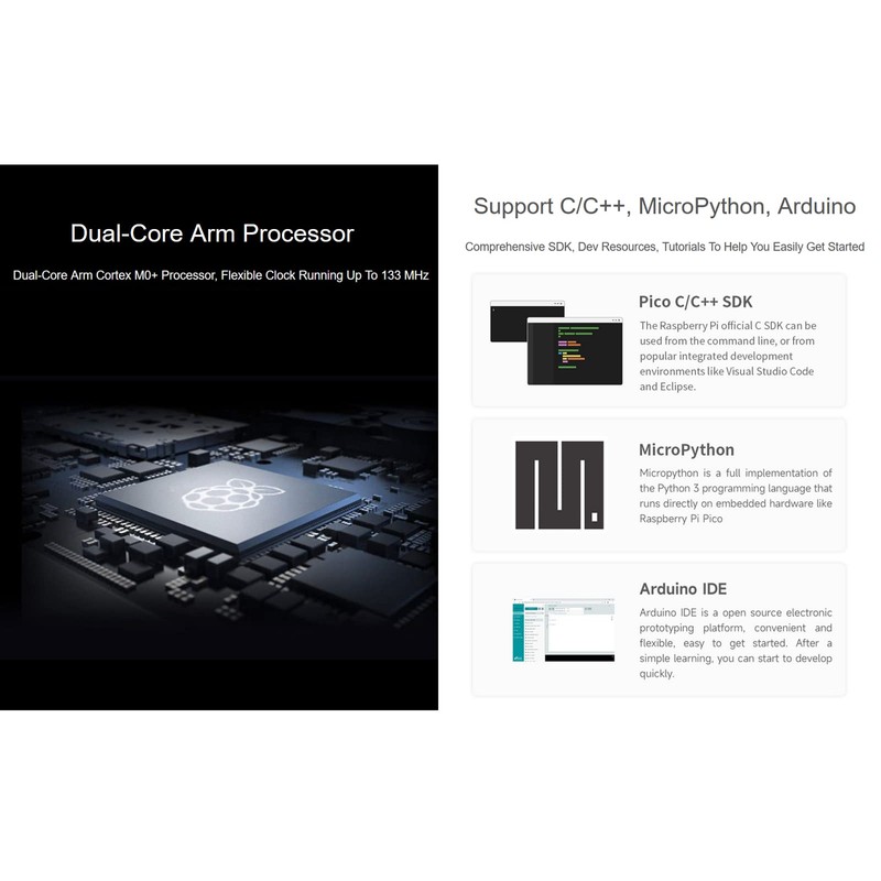 - Dual-core Arm Cortex M0+ processor, flexible clock running up to 133 MHz, 264KB of SRAM, and 2MB of onboard Flash memory, USB 1.1 with device and host support