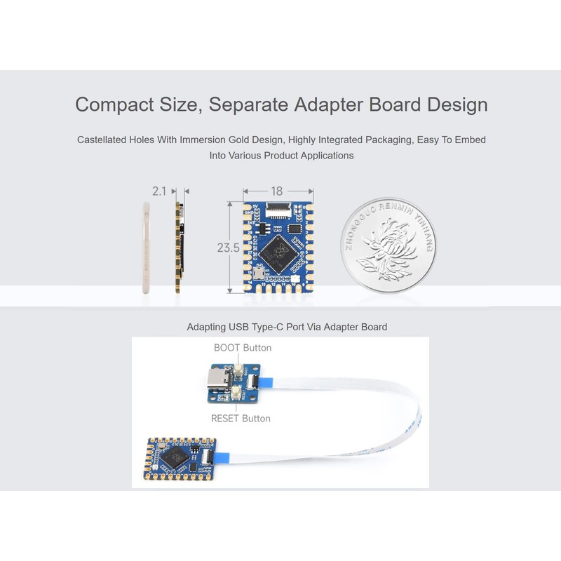 - Waveshare RP2040-Tiny development board based on official RP2040, compact size, separate adapter board design, tiny size, easy integration