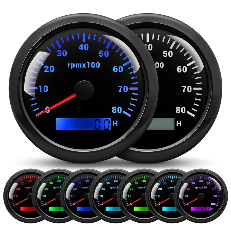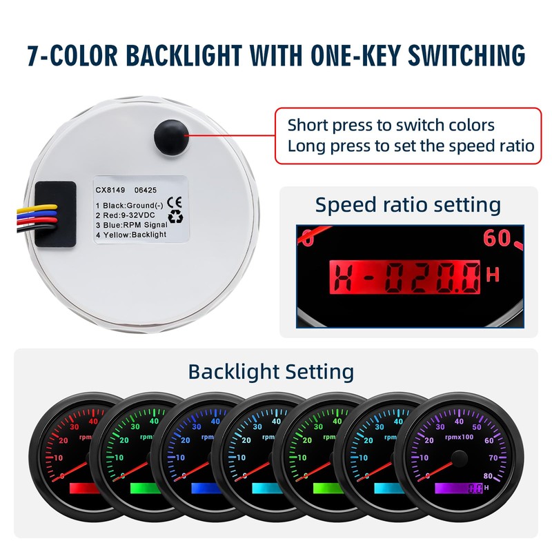 - 【7-Color Adjustable Backlight】 This user-friendly rpm tachometer allows you to personalize your dashboard with 7 backlight colors (Red, Sky Blue, Blue, Olive Green, Green, Purple, White). Simply short-press the button to cycle through hues, enhancing nighttime visibility and matching your interior ambiance.The tachometer for car ensures optimal readability in all driving conditions.This easy-to-use car rpm gauge puts the driver's convenience first.