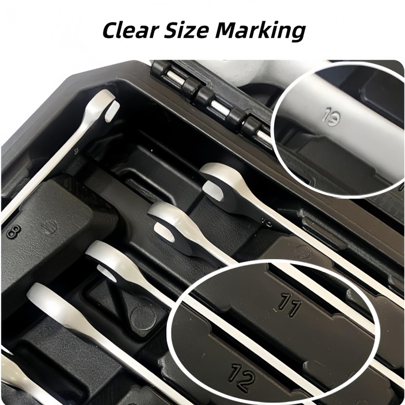 Premium Material: Flex-Head Ratcheting Wrench is made from high-quality carbon steel and Cr-V steel, offering high strength and long-lasting durability, each with clear size marking for easy identification