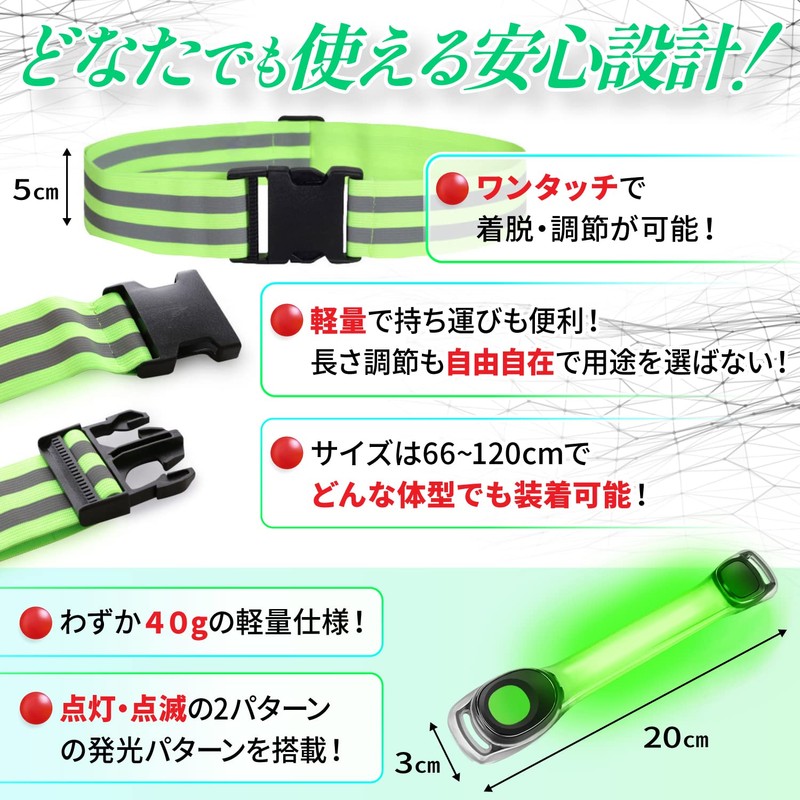 - The high brightness LED armband weighs 1.4 oz (40 g) and is equipped with a light and flashing pattern that provides outstanding presence. You can easily attach it to any size with the Velcro tape. Reflective material on the other side for added safety